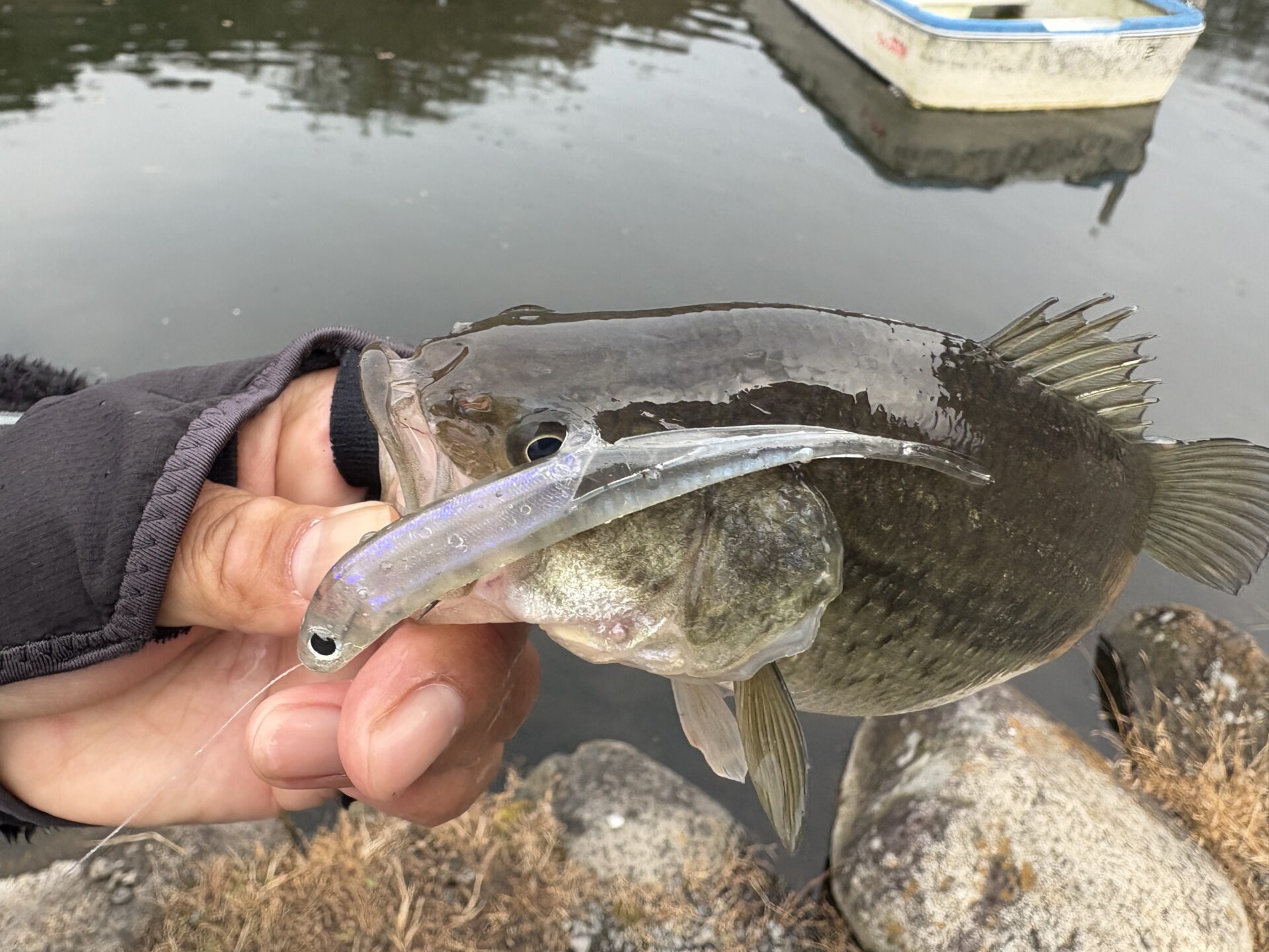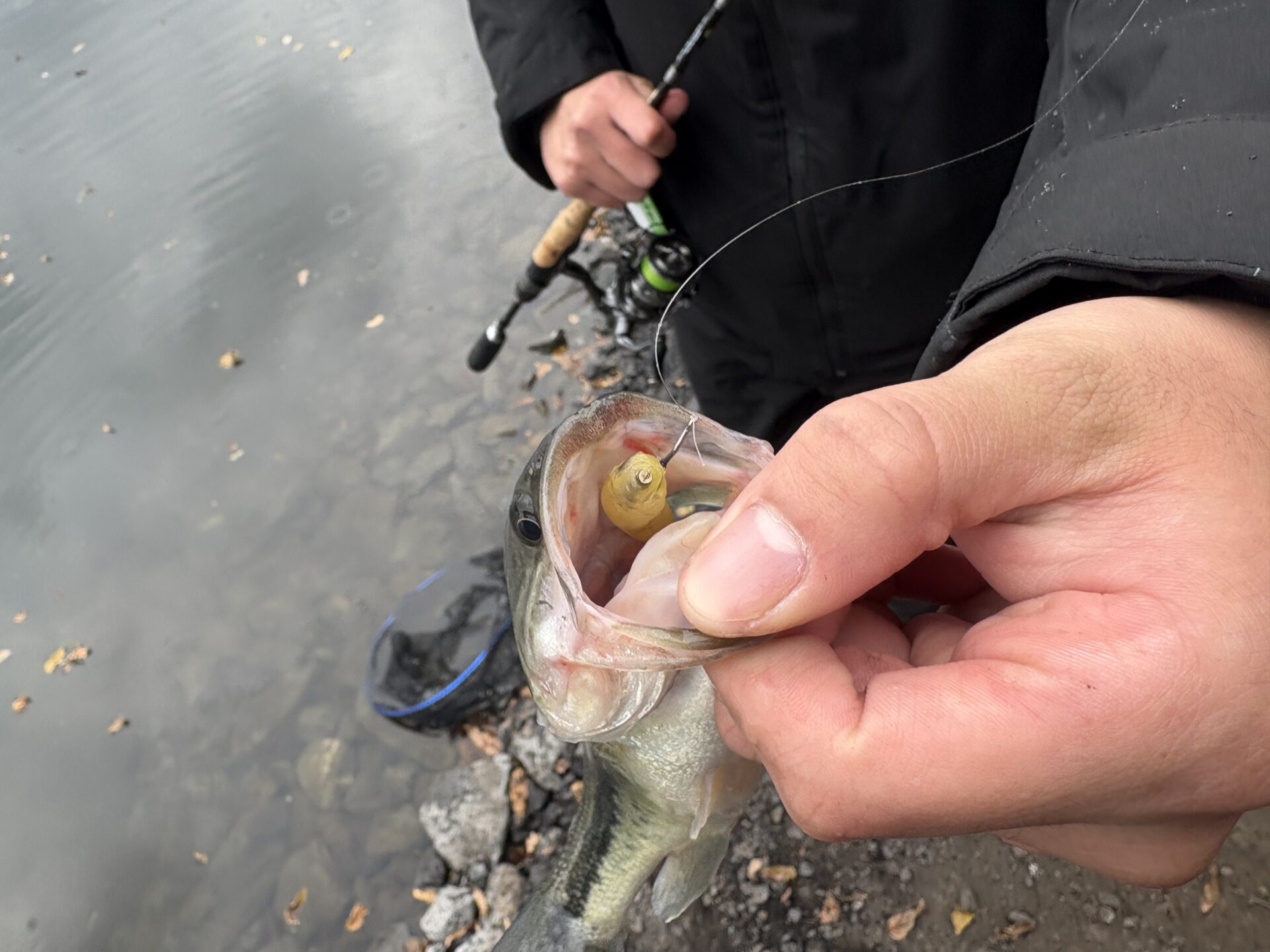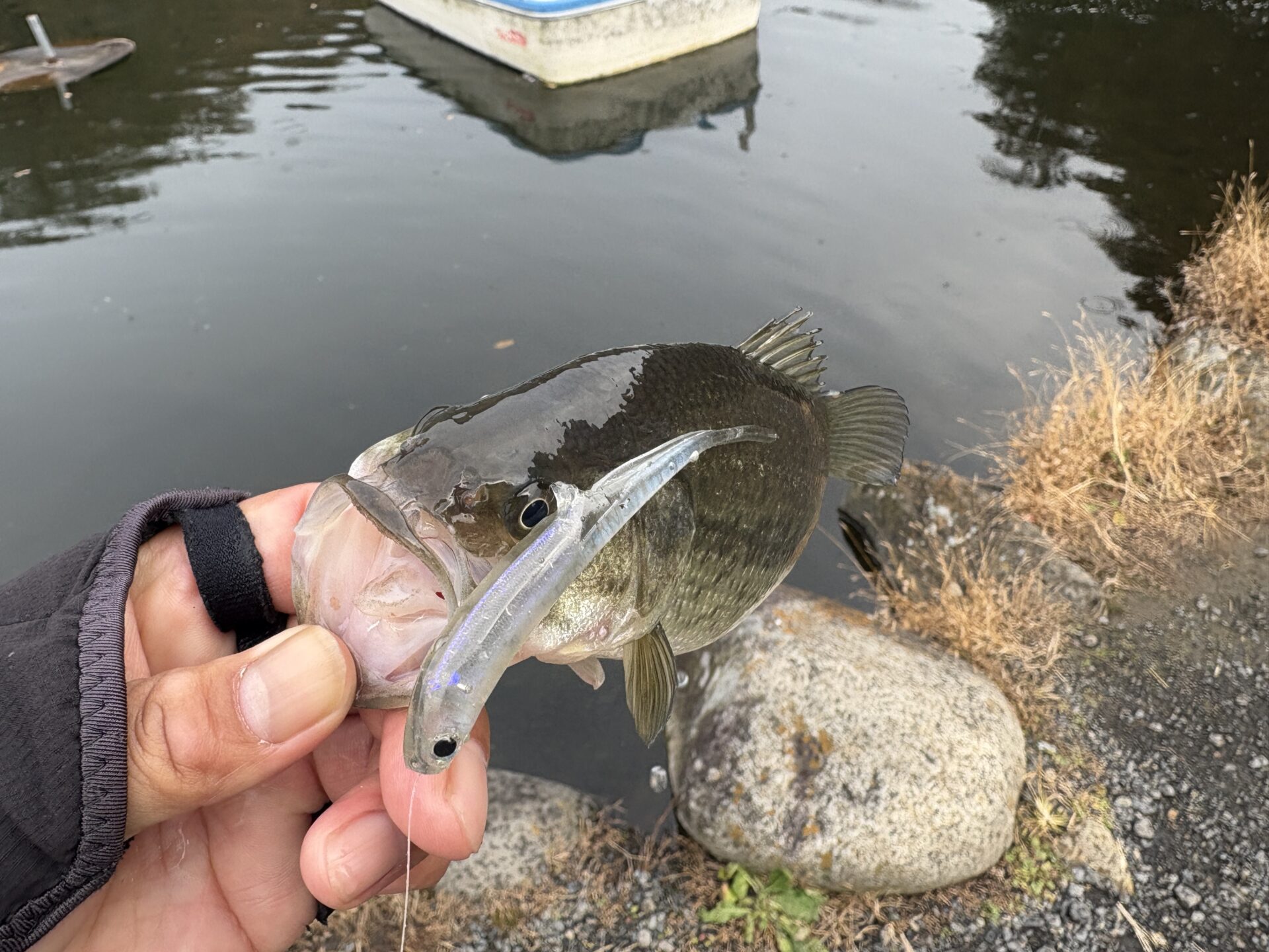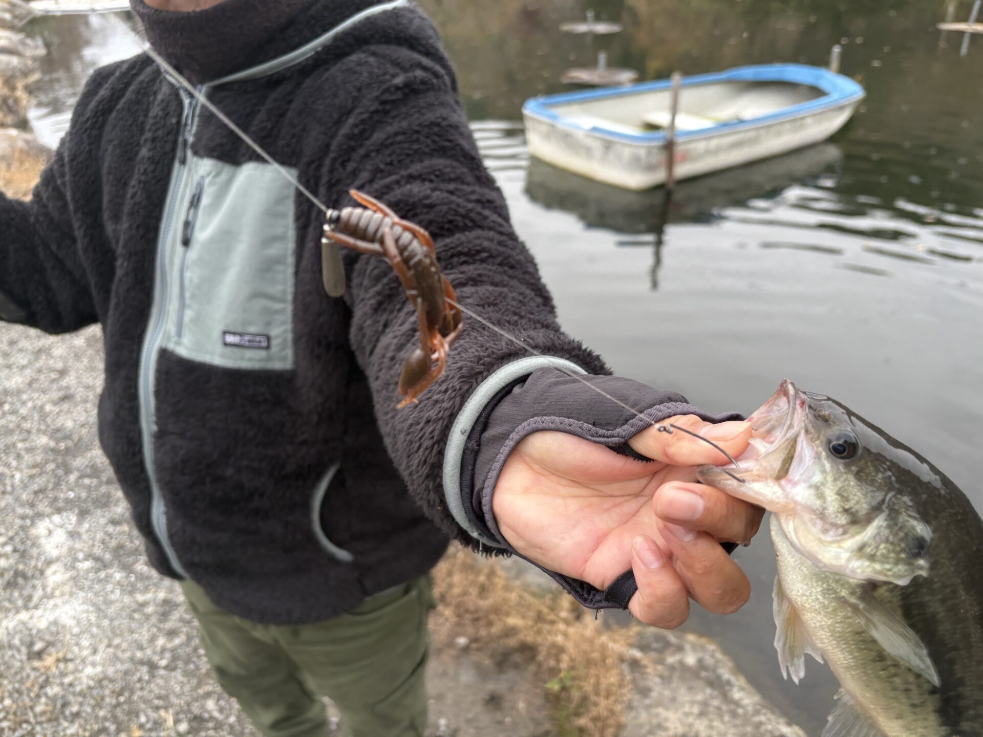 寒さのためか魚の動きは鈍く、ボトムまでワームを落として引きずる・その場で細かくシェイクするなどスローな釣りか円盤裏にいる魚をリアクションで引き出すような釣りが効果的でした。