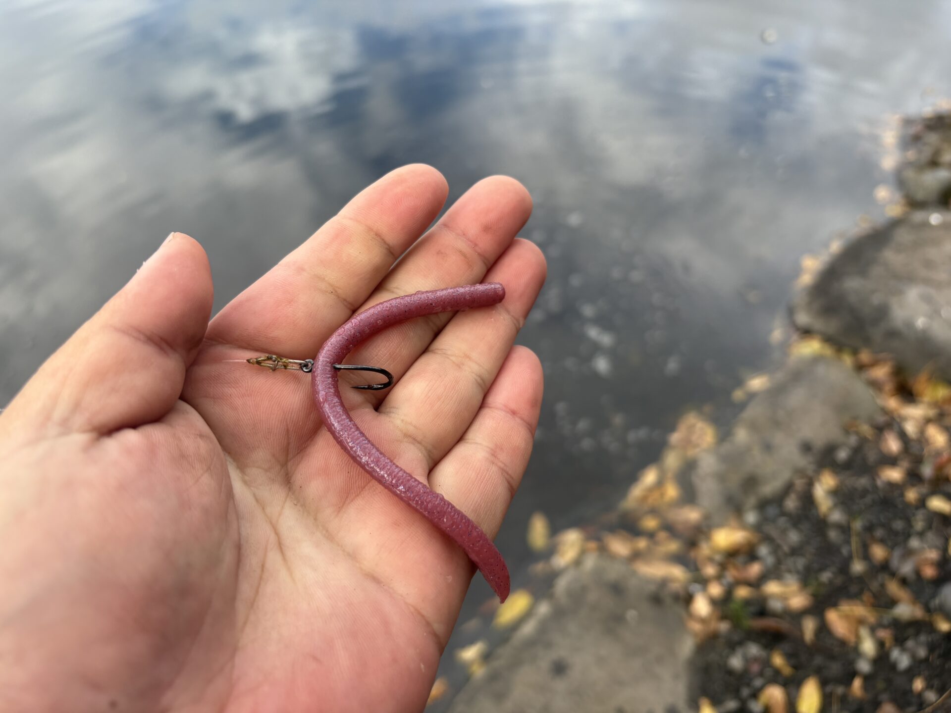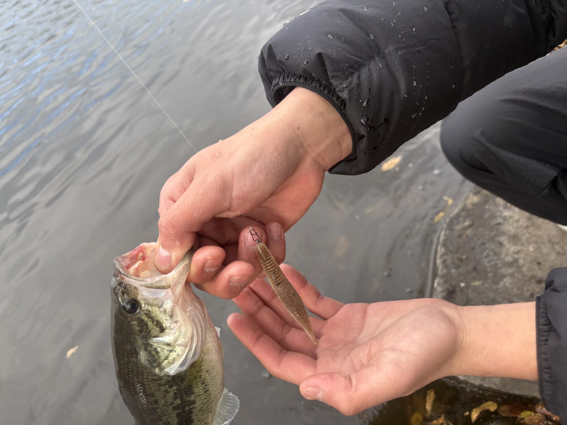 細めのノーシンカーワームやジグヘッドワッキーでボトムまでフォールさせ、引きずるようにスローに動かすとバイトが出ていました!