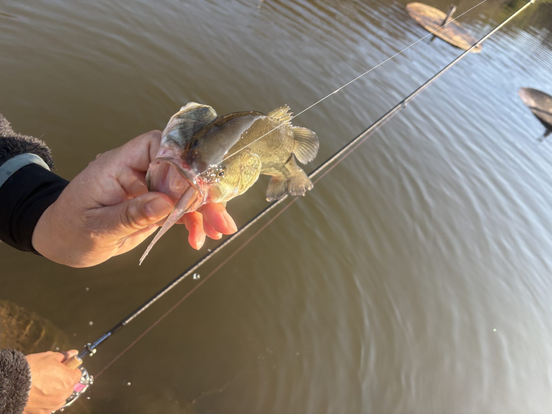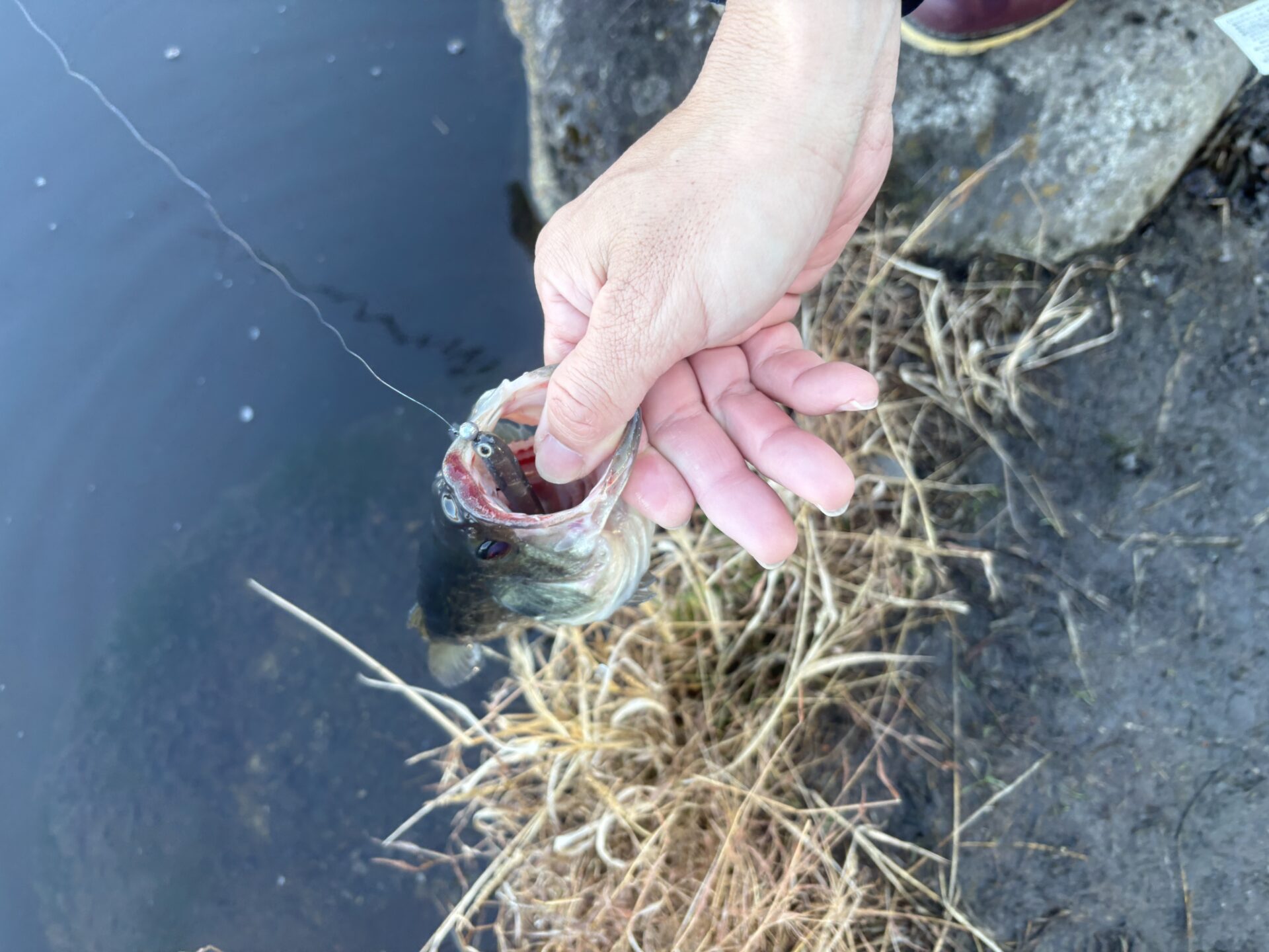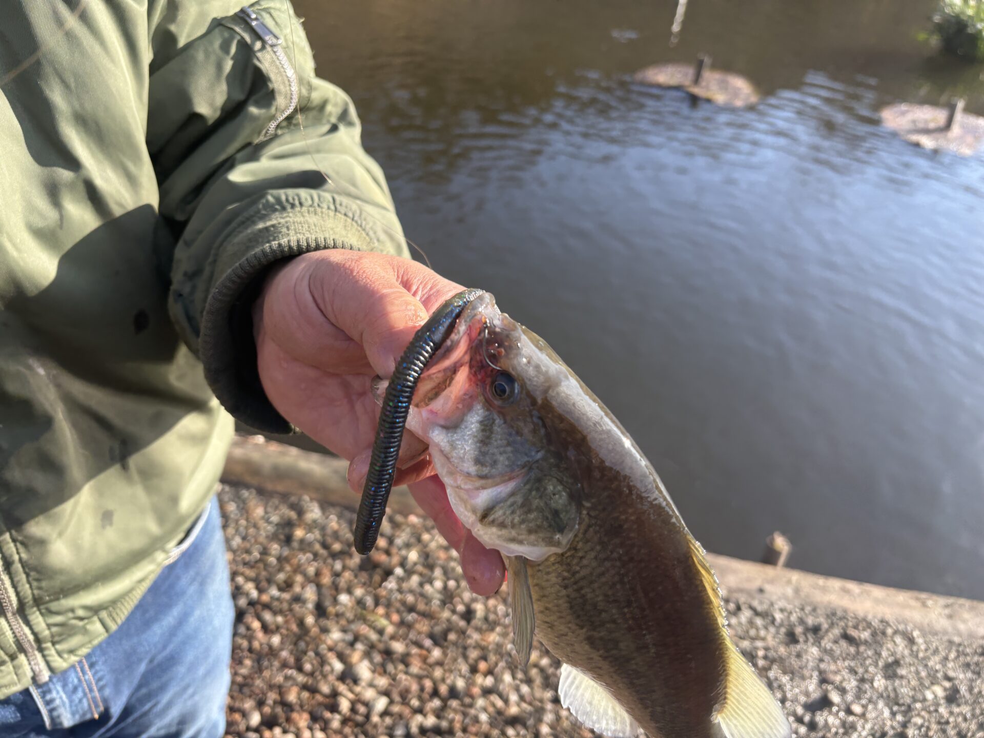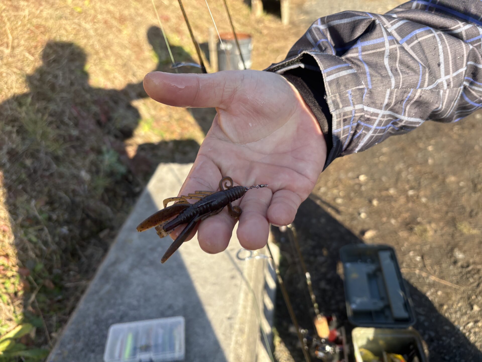 朝一はボトムにべったりの状況ではありましたが、食い気があるバスが多く、かけあがりをワームのずる引きで丁寧に探ったり、ペットボトルのストラクチャーの下や目で見えるボトムの岩の影などにワームを落として細かくアクションをつけると釣れていました!