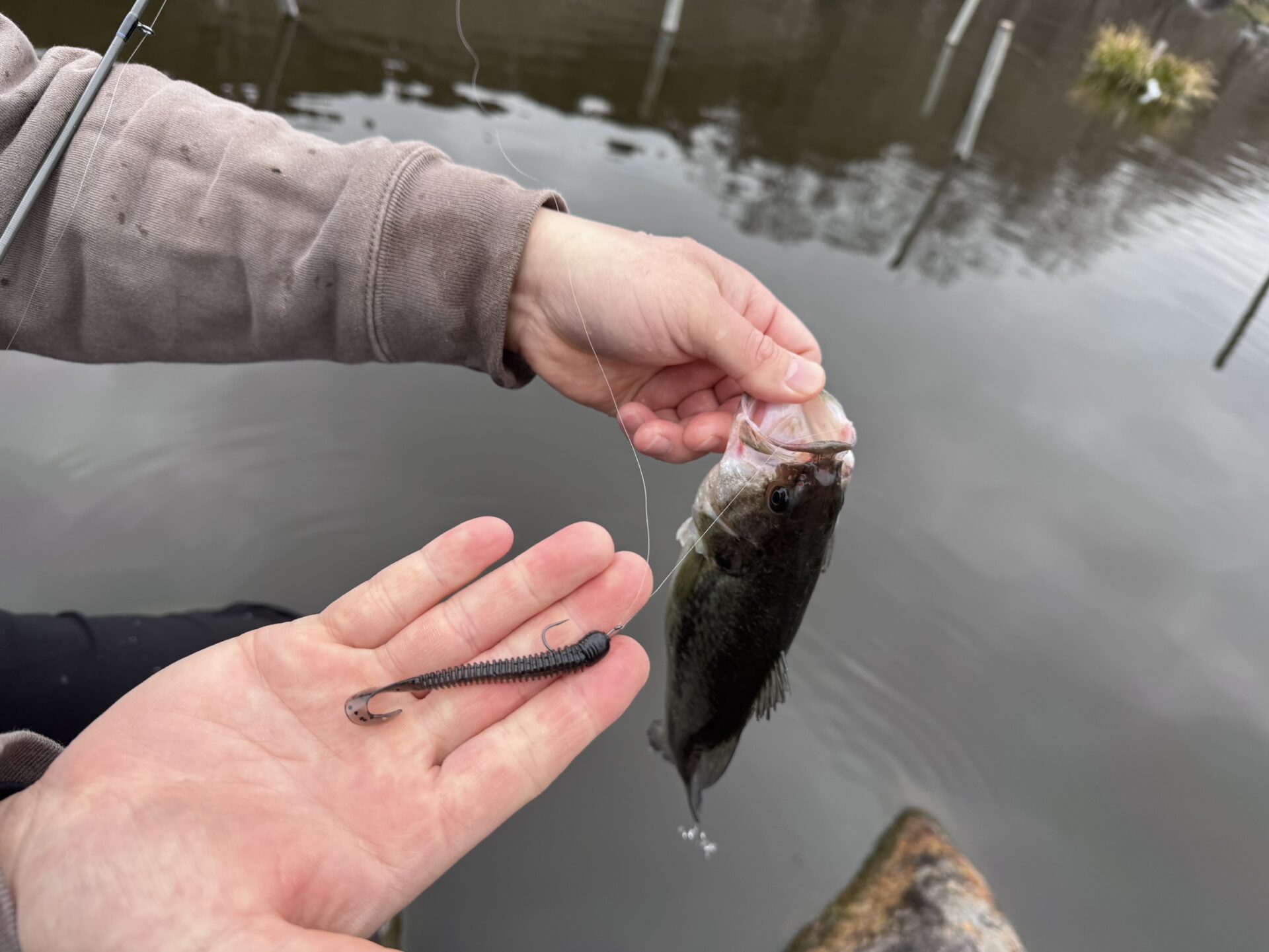 また、日中は気温が上がりカバーや円盤の下にいるバスに対してネコリグやスモラバの吊るしでかなり釣れていたように感じました。暖かく、バスも動いていますが丁寧に釣っていくことが大切な一日に感じました。