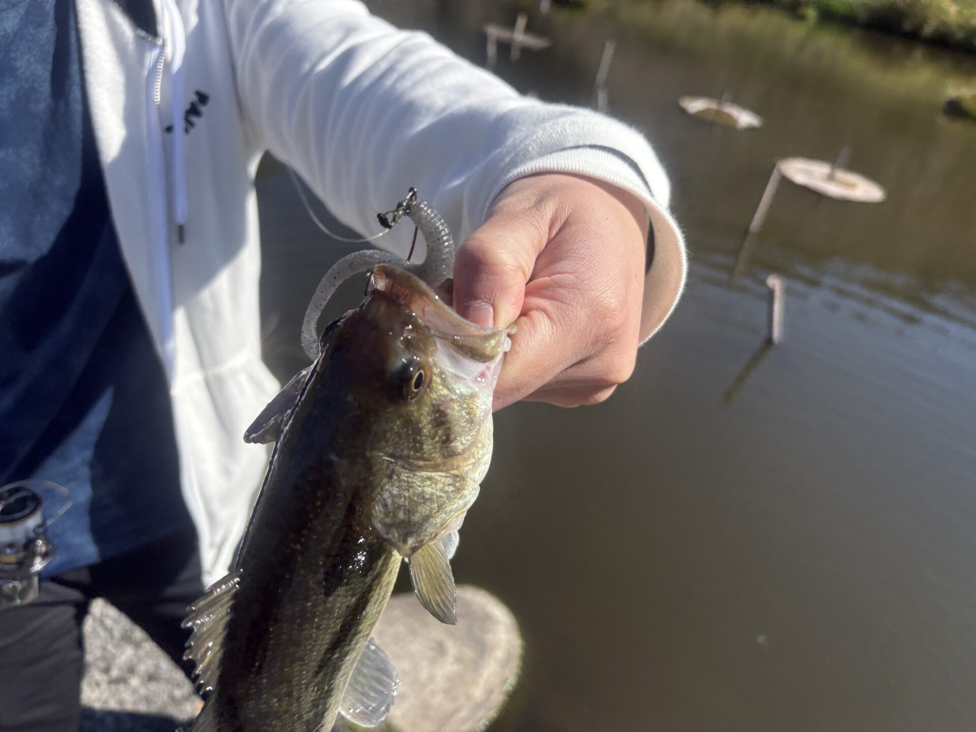 バスは浮いている状況でしたが、横の動きにはなかなか対応せず、ワームをスローに巻いて障害物横を通すか、フォールで食わせるかのどちらかが良かったようです!