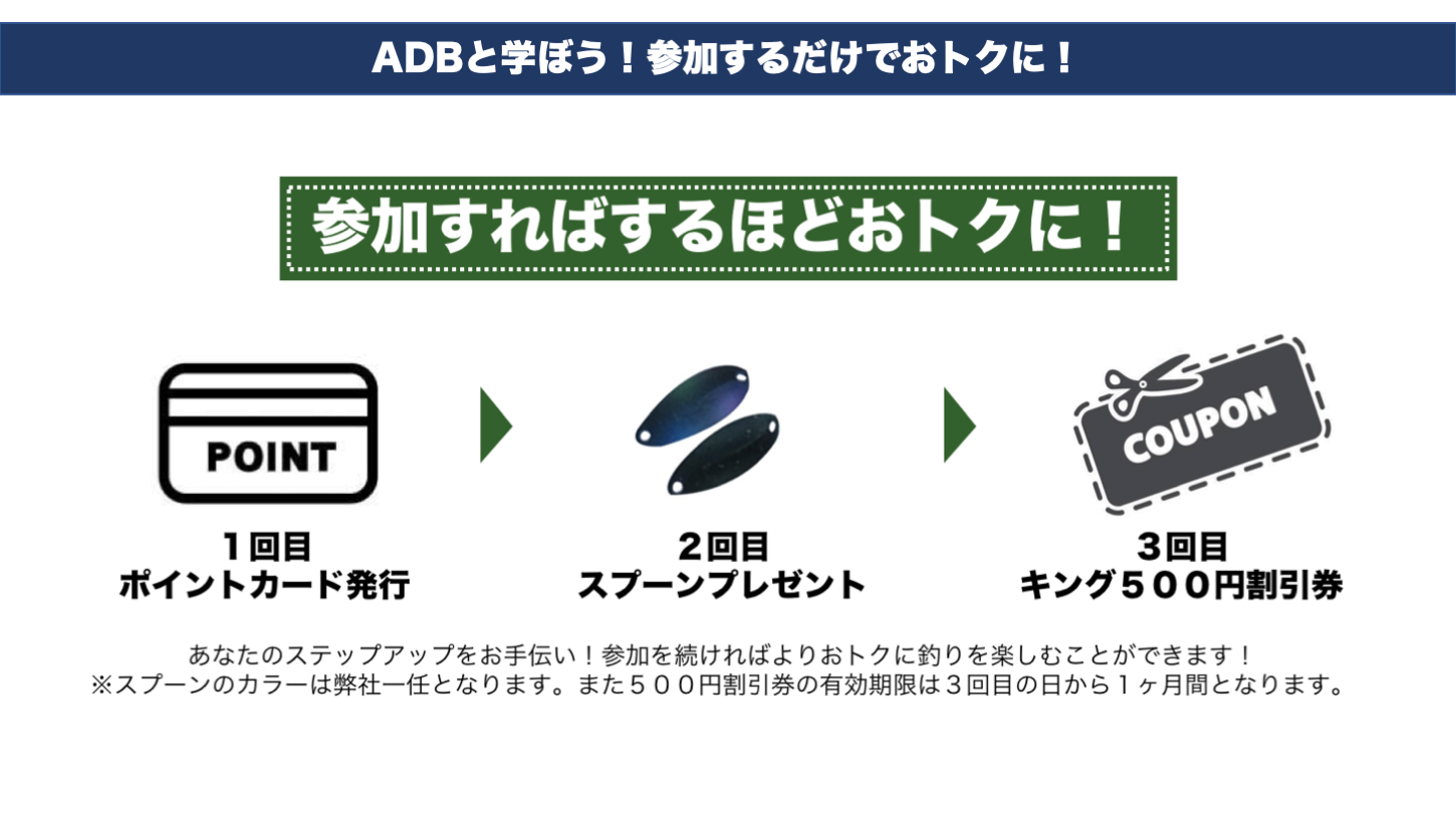 なかなか近くに釣りをする人がおらず、教えてくれる人もいない!という方にはぜひオススメ!ADBスタッフがあなたの釣りをレベルアップさせます!
