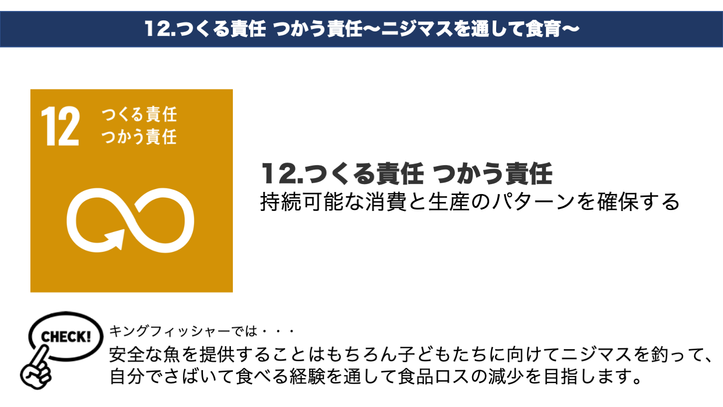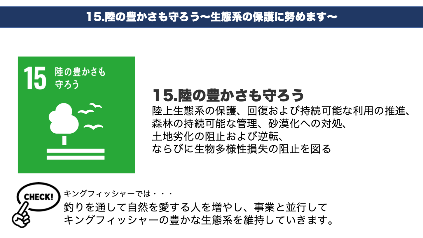 このSDGsは、17のゴール・169のターゲットから構成され、日本を含め、全世界の組織が達成に向けて努力をしています。キングフィッシャーでは17の目標のうち、4つの目標達成に向けて管理釣り場を運営しております。