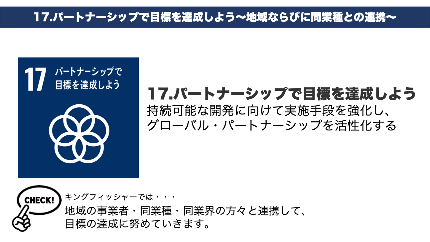 以上4つの目的を達成するため、キングフィッシャーでは「SDGs」になぞらえた事業展開を行っております。まずはこの「SDGs」についてお話をしていきます。