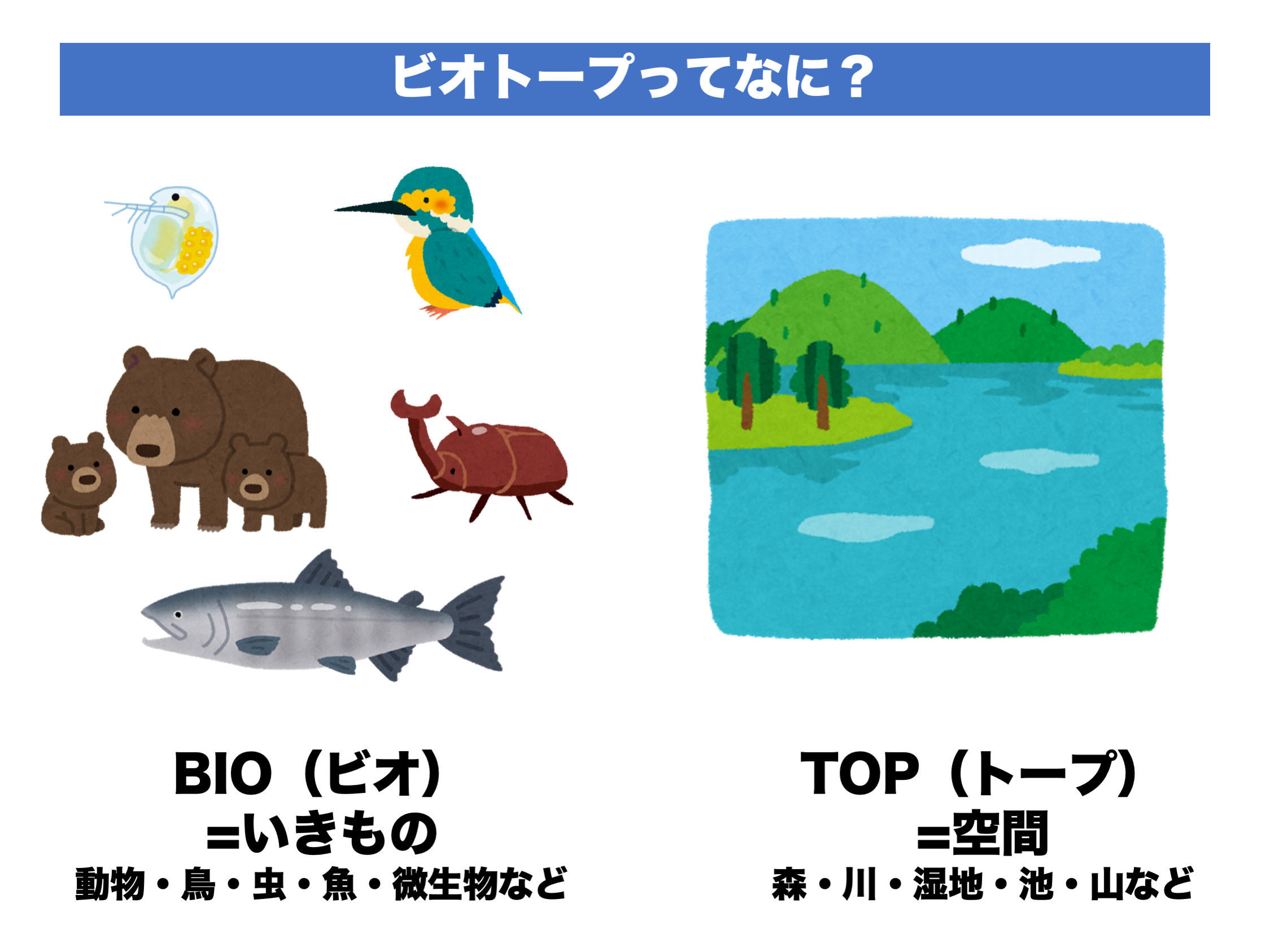 まずは「ビオトープ」についてお話しいたします。「ビオトープ」とはドイツ語で、ビオ(Bio)は「生きものたち」、トープ(Top)は空間という意味です。日本語では「生物生息空間」と呼ばれたりもします。