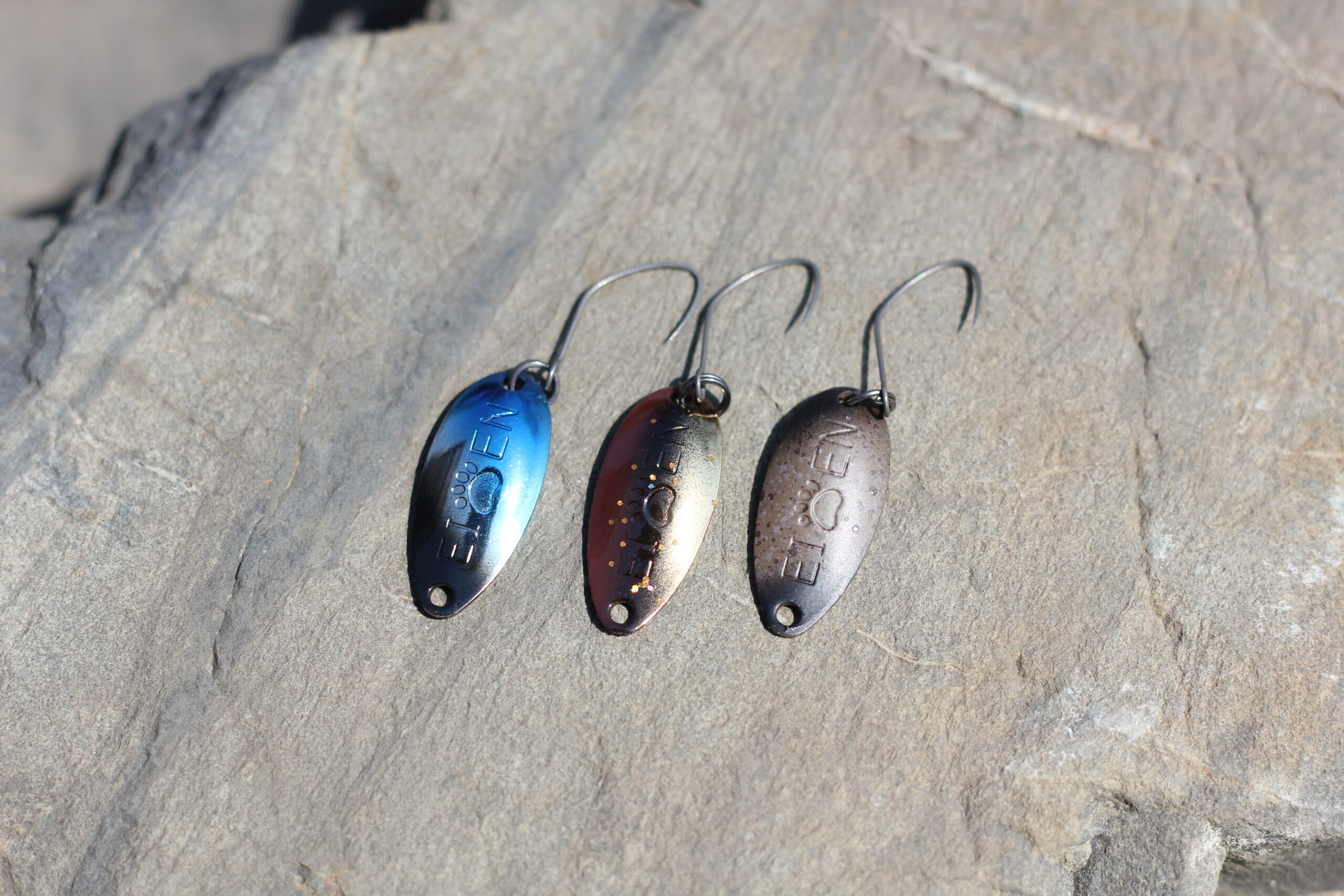 今回、販売するのは3種類のスプーンです。スプーンのカラーは後ほど紹介いたしますが、キングフィッシャーでよく見られる3種類のいきものがモチーフとなったカラーです。もちろん、釣果はお墨付き。キングフィッシャーでテストし、釣れることが実証されたスプーンです。