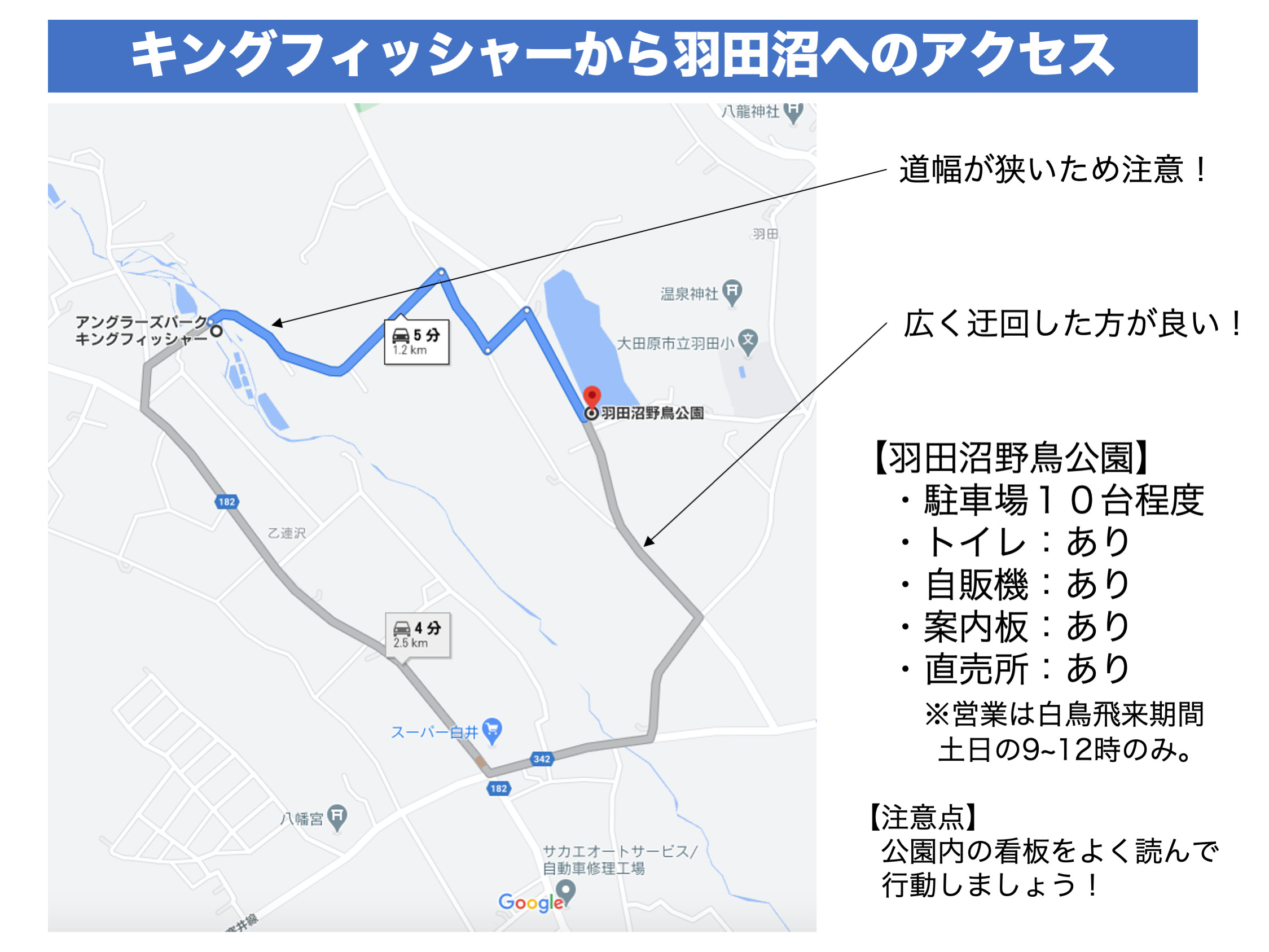 キングフィッシャーからだと車で5分程度の場所にあります。大田原市においては市内2カ所のハクチョウの飛来地のうちの1カ所であり、飛来する10月末〜3月末には多くの愛鳥家がハクチョウの美しい姿を撮るために通い詰める場所でもあります。