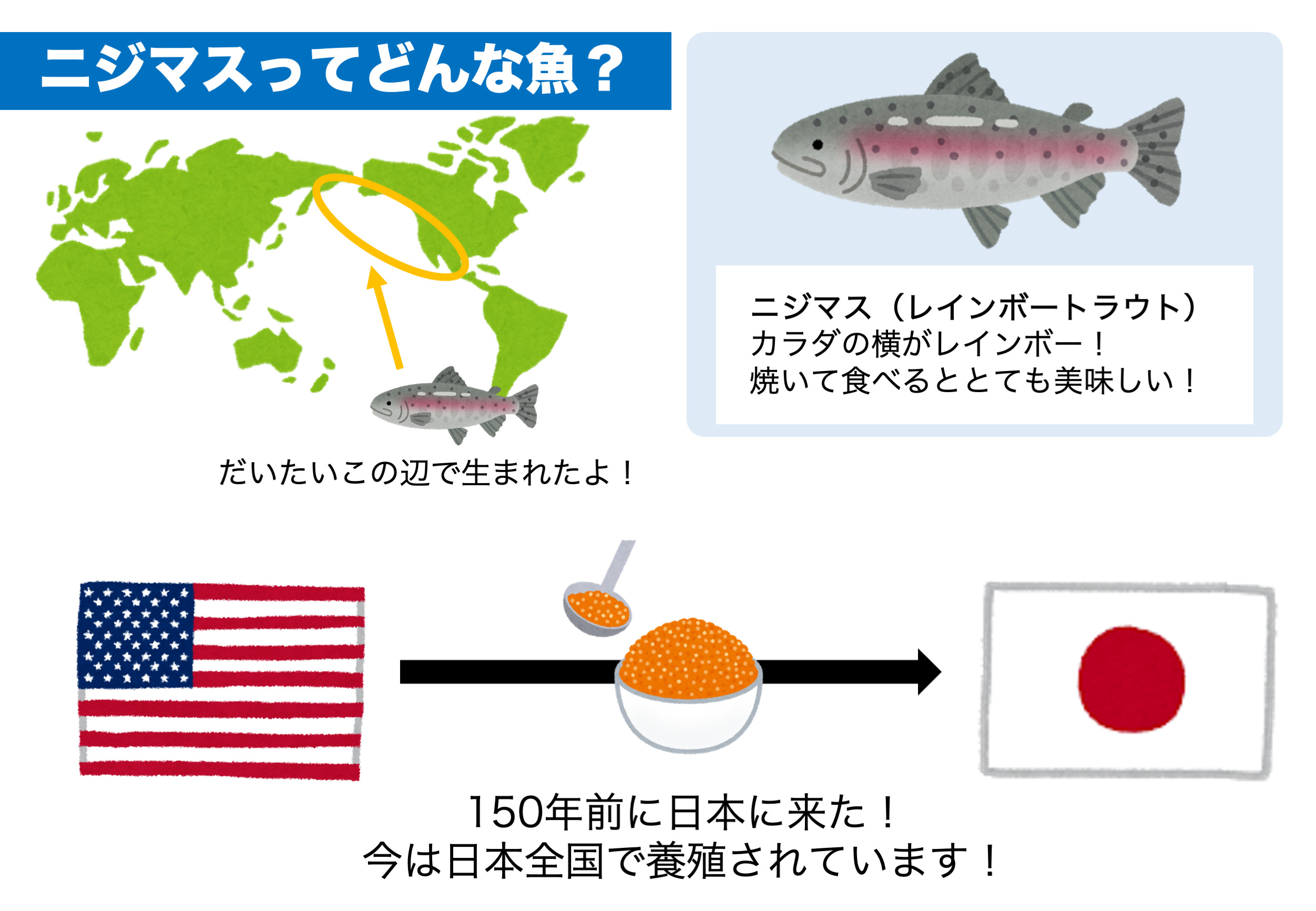 日本に来たのは明治時代、今から約150年前。ニジマスの卵1万個がアメリカから寄付された時のことです。