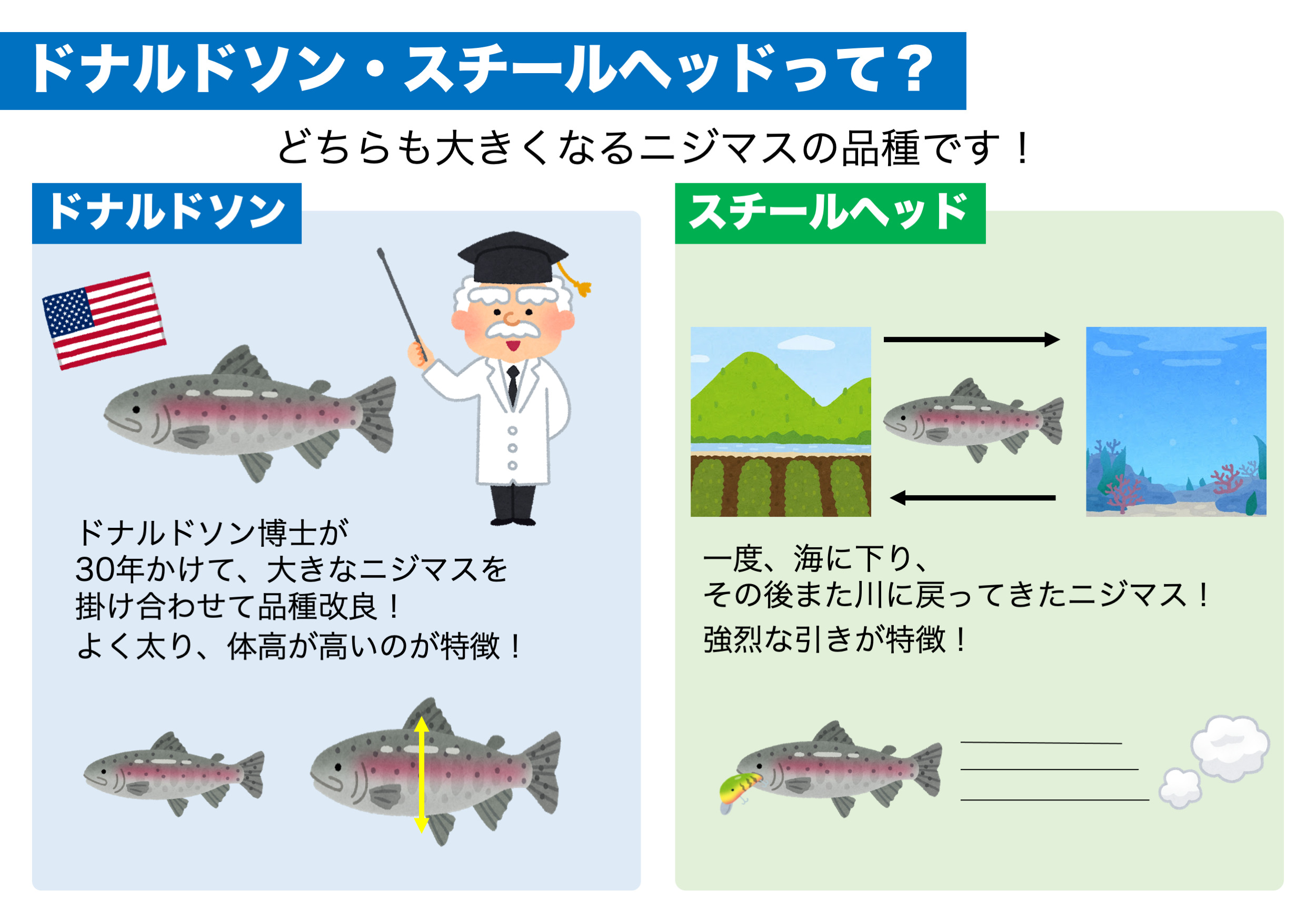 よく、ニジマスの品種で耳にするのは「ドナルドソン」と「スチールヘッド」。この2つの品種は大きく育つことで有名です。