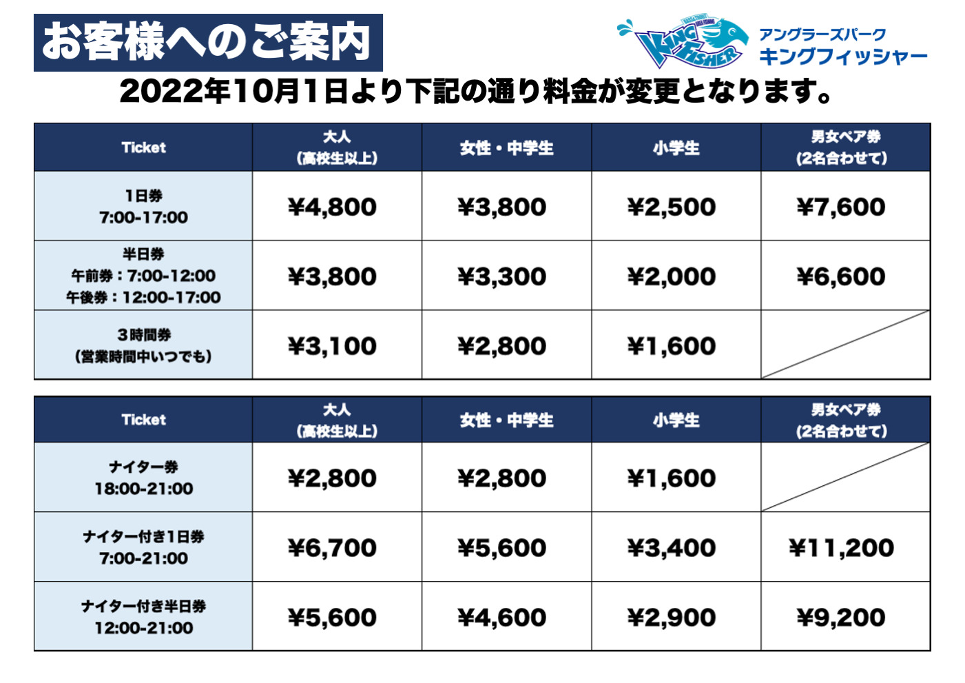 10月のナイター営業日は下記の通りとなります。 10月7日(金) 10月8日(土) 10月9日(日) 10月10日(月祝) 10月14日(金) 10月15日(土) 10月16日(日) ※10月よりナイター料金も変更となります。 ※本年のナイター営業は10月16日を以て終了いたします。