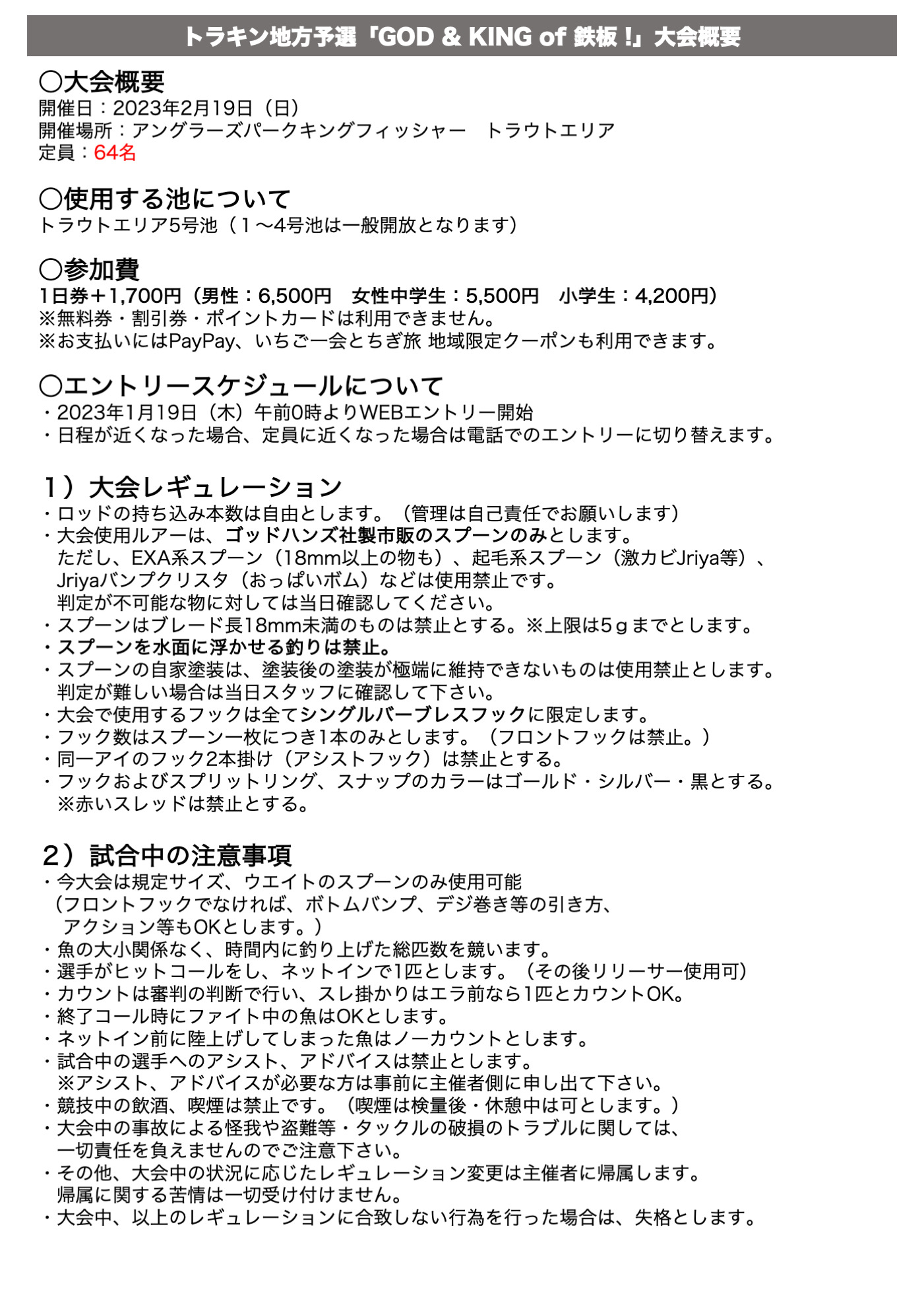 ・大会使用ルアーは、ゴッドハンズ社製市販のスプーンのみとします。ただし、EXA系スプーン(18mm以上の物も)、起毛系スプーン(激カビJriya等)、Jriyaバンプクリスタ(おっぱいボム)などは使用禁止です。判定が不可能な物に対しては当日確認してください。
