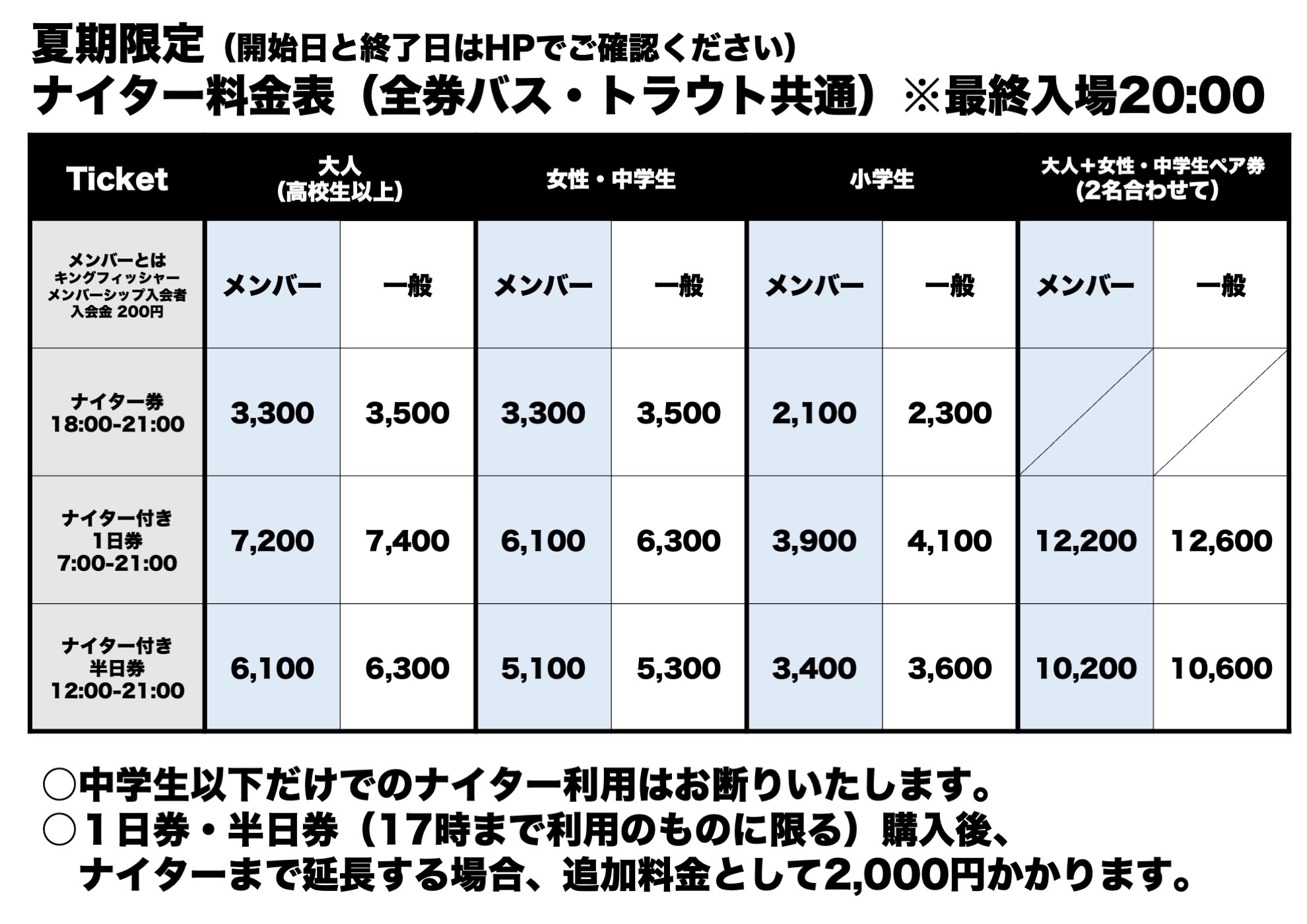 また、学割は大人料金の1日券・半日券・ナイター付き1日券・ナイター付き半日券にのみ適用となります。(大人料金の3時間券・ナイター券、女性・中学生、小学生は対象になりません。)新料金は下記の通りです。