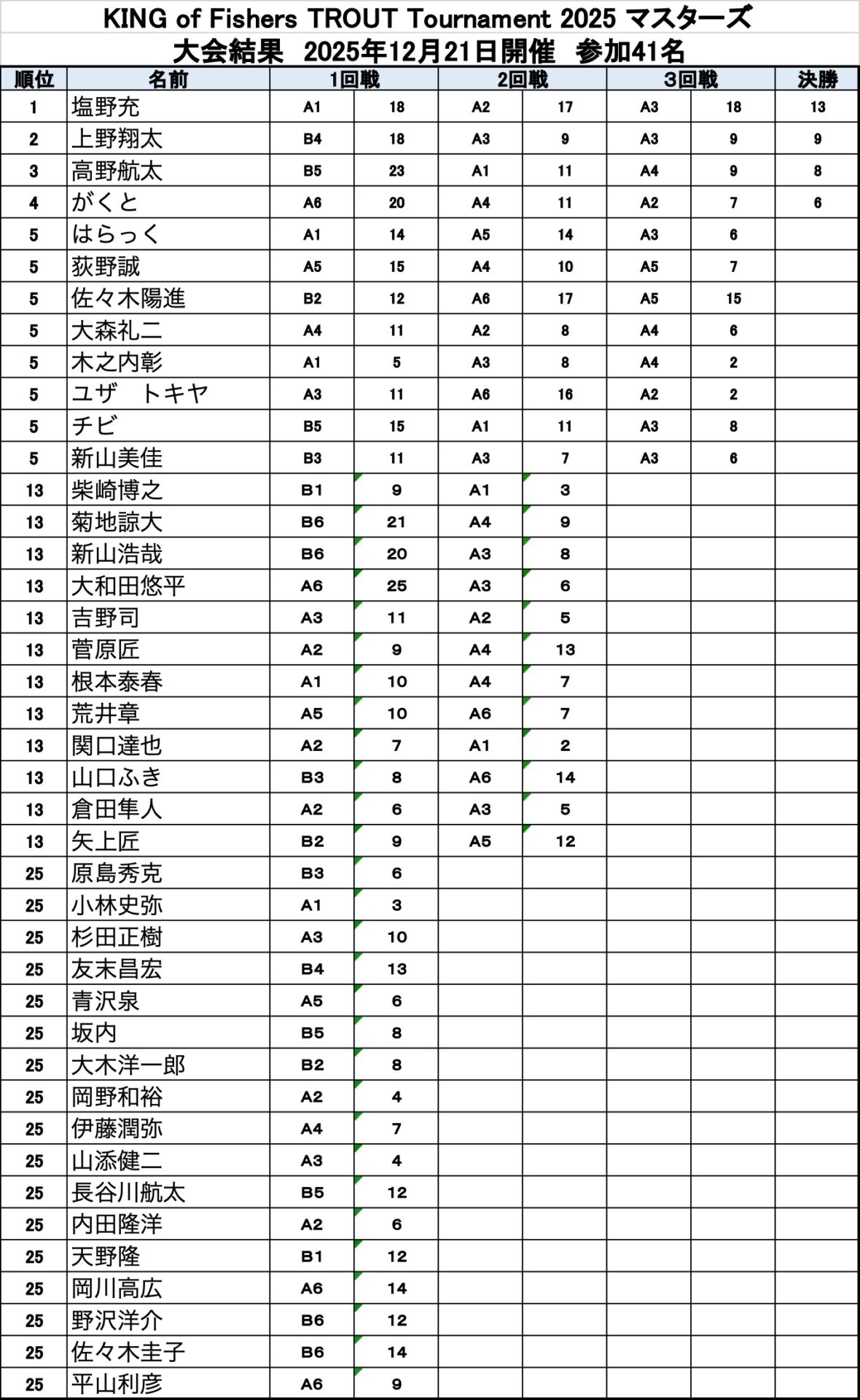 「KING of FISHERS TROUT Tournament 2025 マスターズ」 大会結果