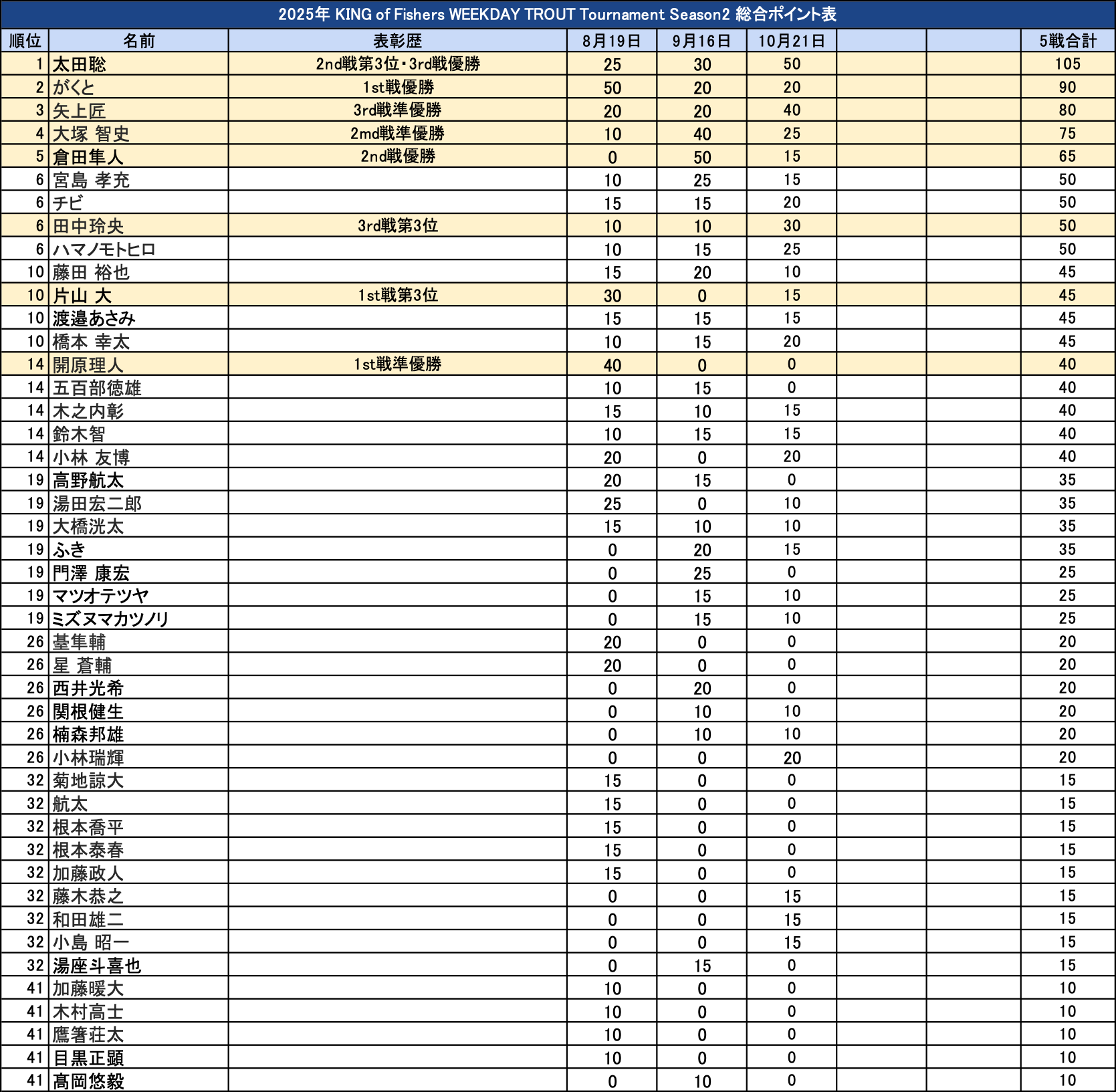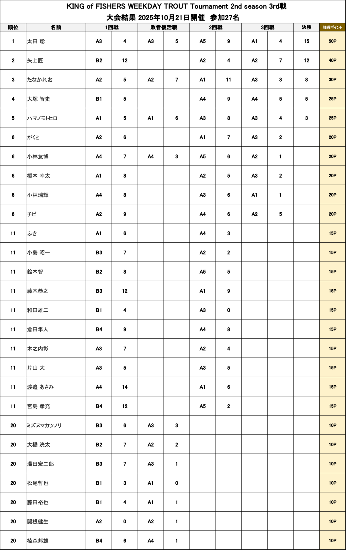 「KING of Fishers WEEKDAY TROUT Tournament 2025 2nd season 第3戦」大会結果