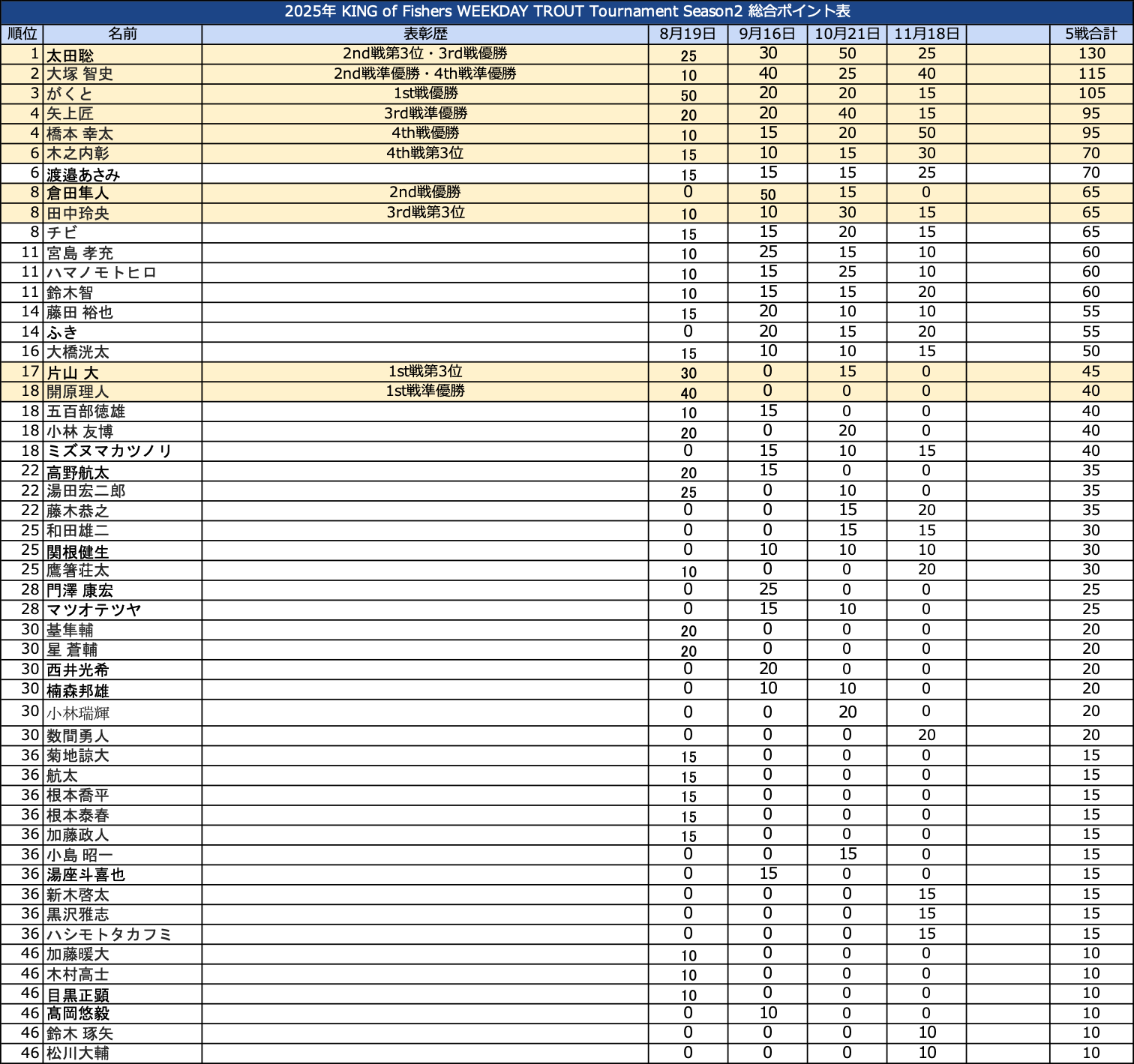 「KING of Fishers WEEKDAY TROUT Tournament 2025 2nd season 第4戦」大会結果