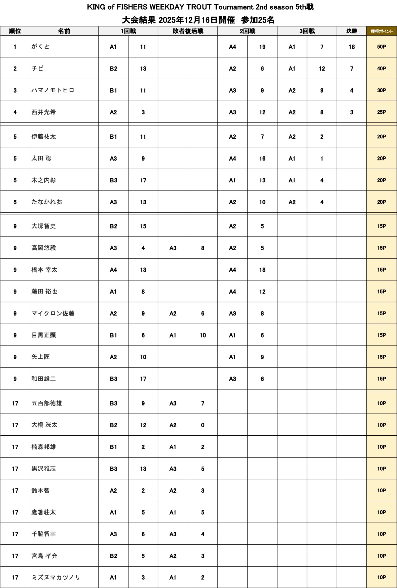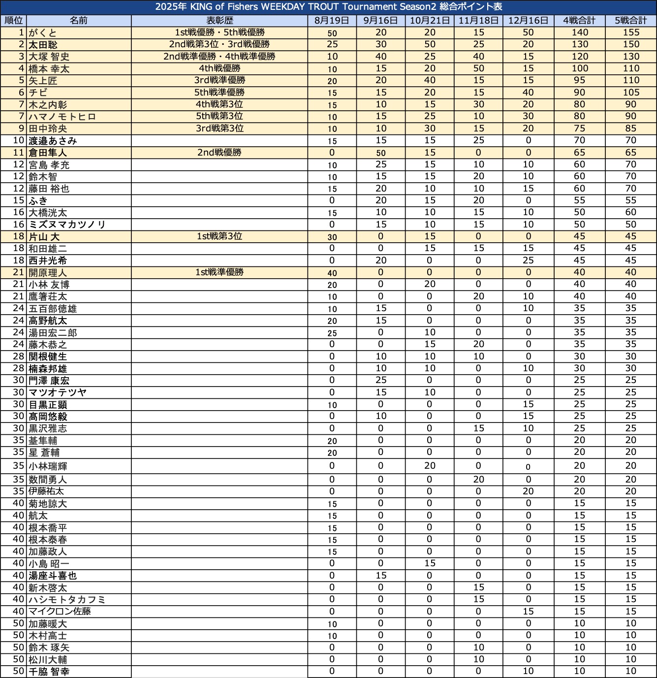 「KING of Fishers WEEKDAY TROUT Tournament 2025 2nd season 第5戦」大会結果