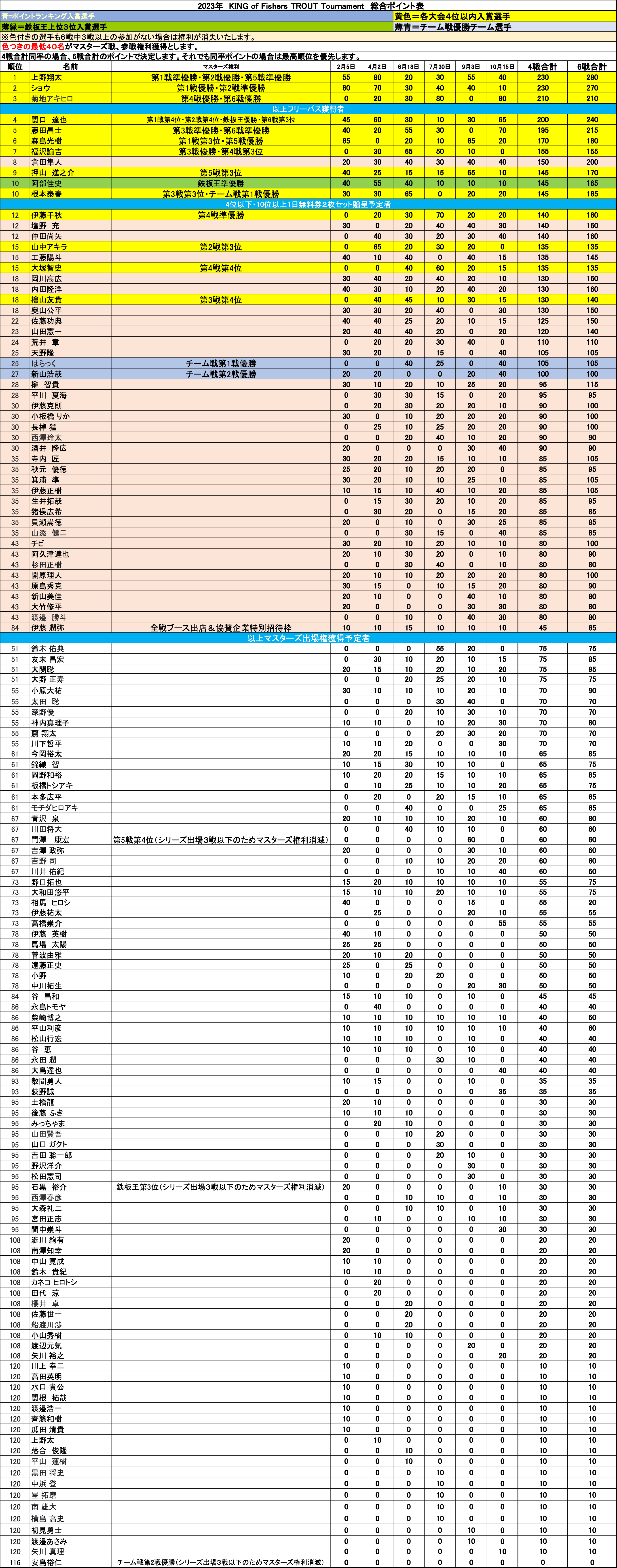 【確定版】「KING of Fishers TROUT Tournament 2023」総合ポイント表