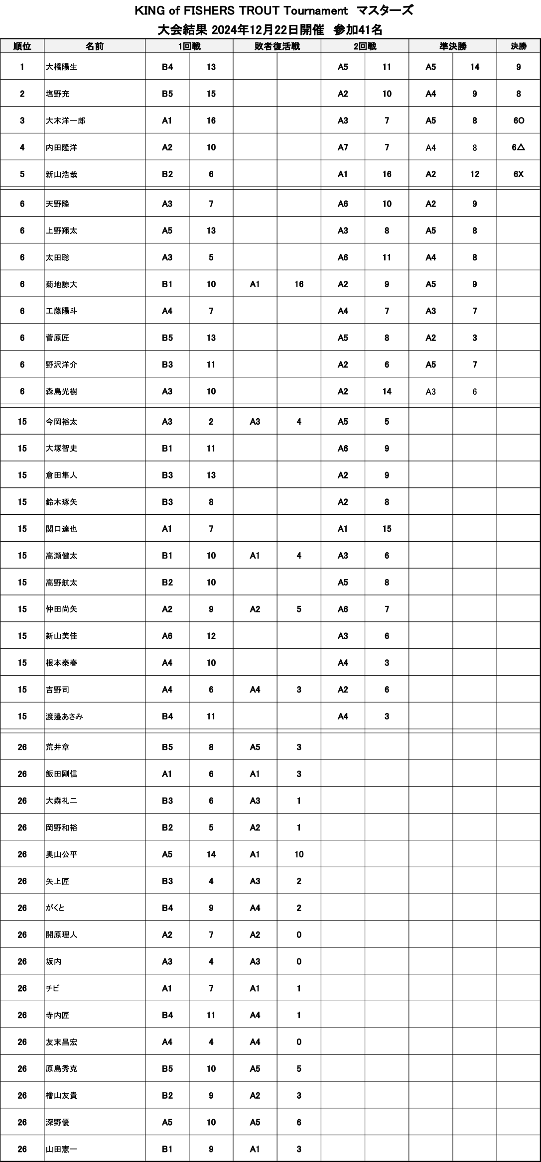 KING of Fishers TROUT Tournament 2024 マスターズ戦結果