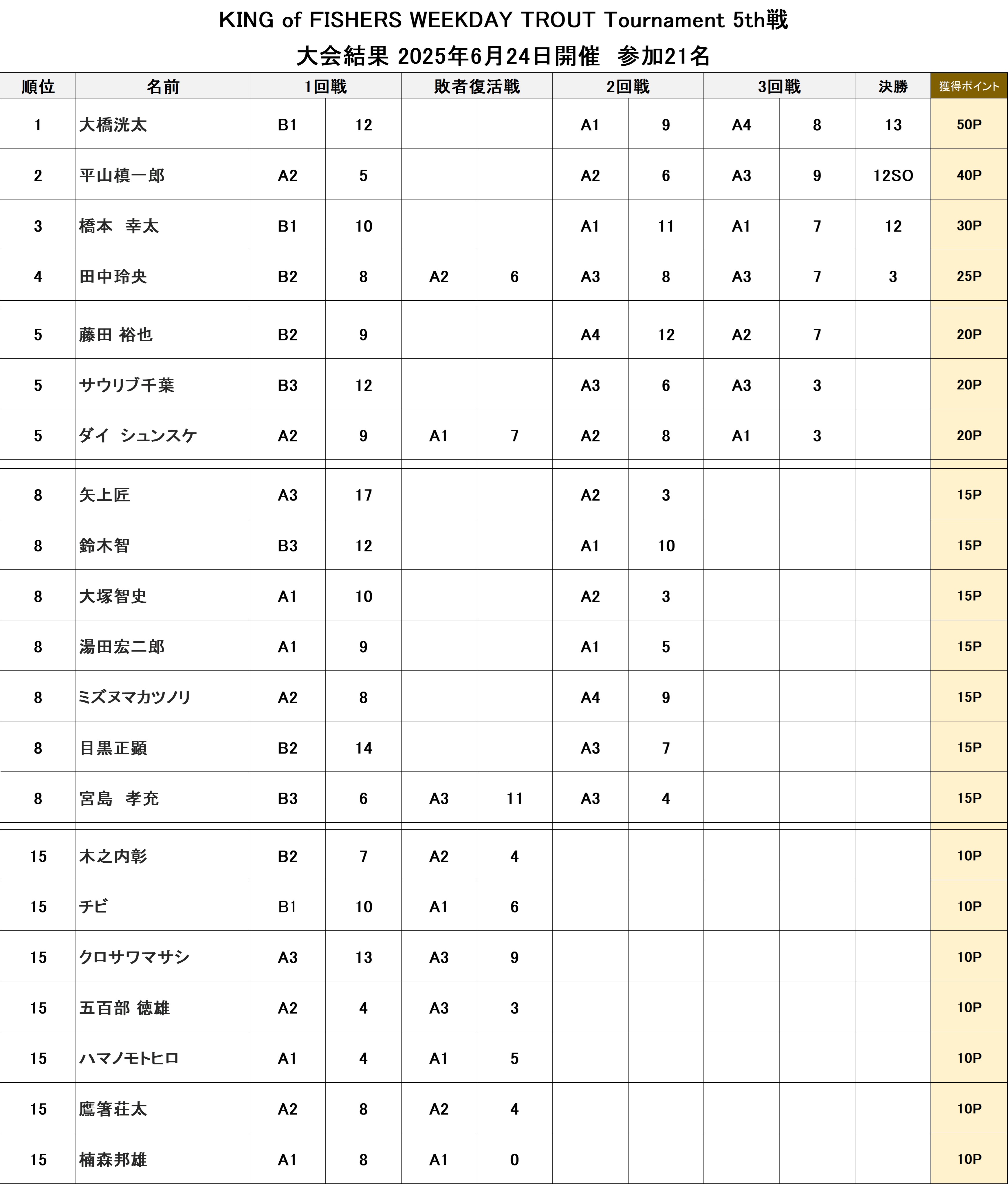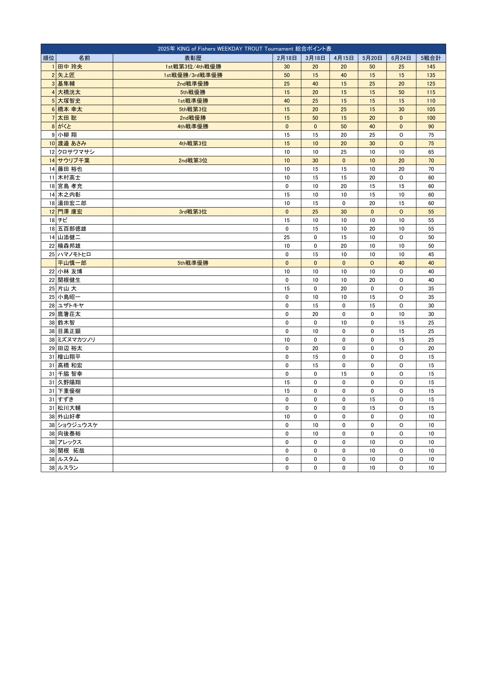 「KING of Fishers WEEKDAY TROUT Tournament 2025 第5戦」大会結果