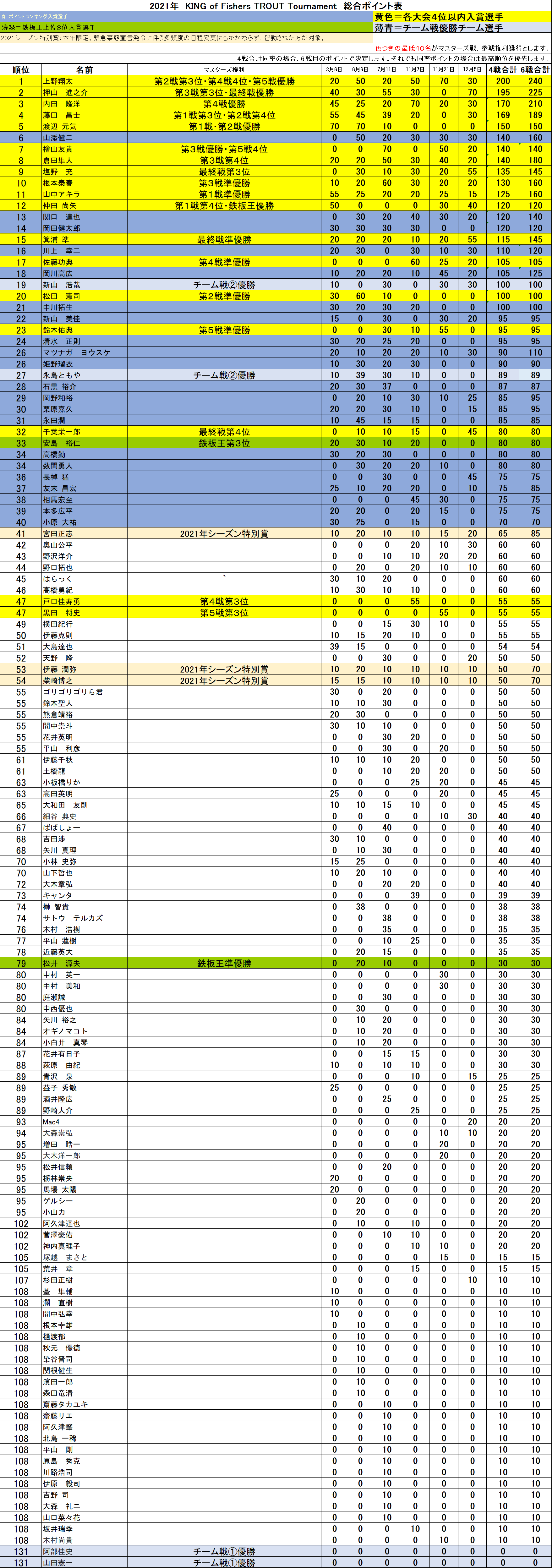 「KING of Fishers TROUT Tournament 2021」総合ポイント表