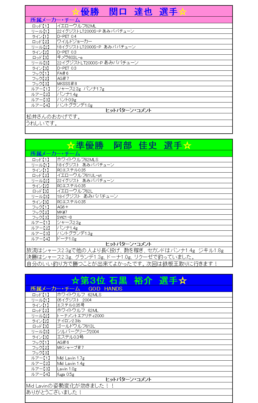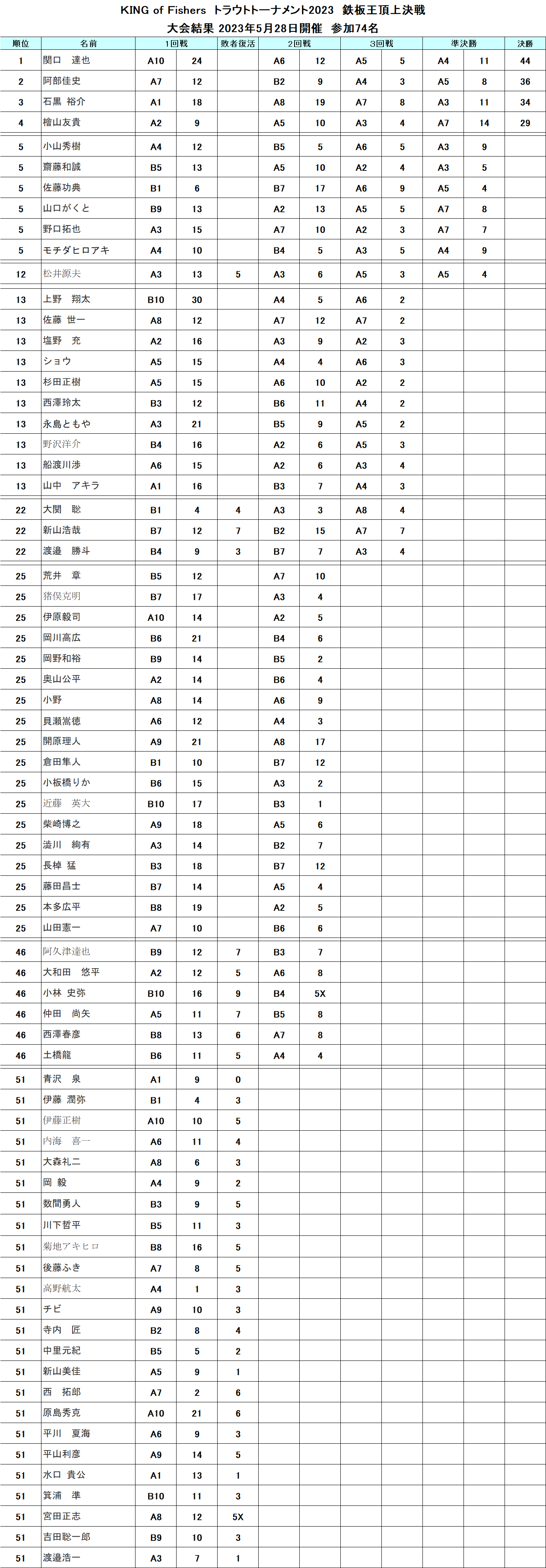 KING of Fishersトラウトトーナメント2023鉄板王頂上決戦 結果・タックルデータ