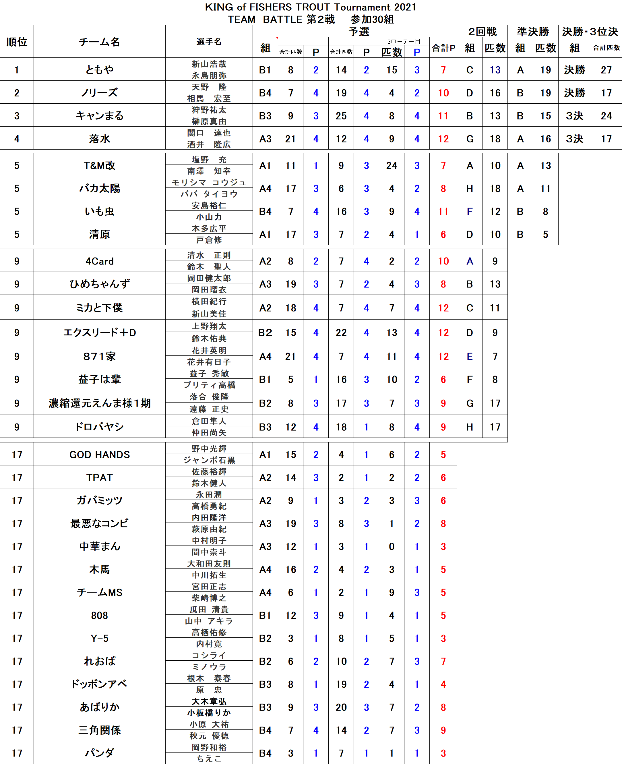 KING of Fishersトラウトトーナメント2021 TEAM BATTLE 第2戦 結果
